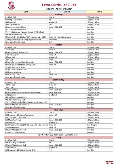 In addition to the normal school timetable, there is a great variety of lunchtime and after school activities and clubs in the school. This term we have the following available: